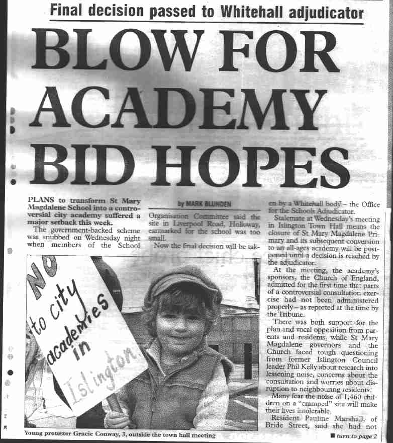 The planning committee decided to approve the application to close St Mary Magdalene Primary School, which opens the way for the establishment of a 1600 pupil City Academy on the enlarged site. This was despite a considerable local opposition including teaching unions and parents. More information on the Islington Campaign Against Academies.