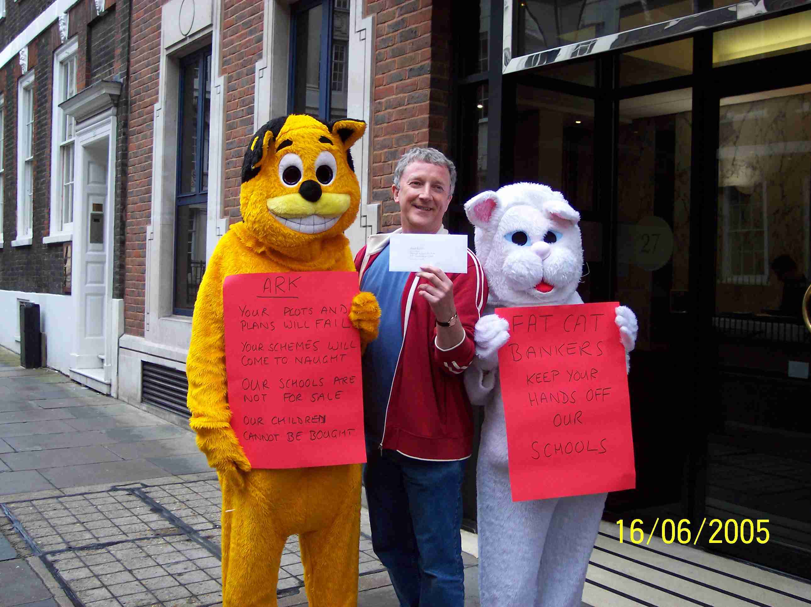 | Fat Cats: Academies give state schools to private companies. | Paws Off: Teachers and parents object to their schools being given away. |